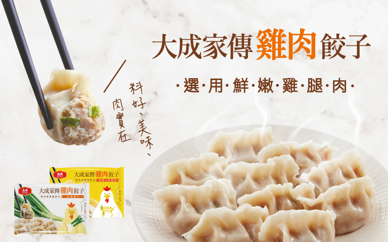 藉由大成雞肉龍頭的優(yōu)勢及把關,開發(fā)雞肉水餃,絕不用便宜絞肉混充!選用大成嚴選雞腿肉,並保留腿肉口感,飽滿紮實又皮薄Q彈,提供消費者更多元食用選擇,食用來源清楚的品牌水餃
