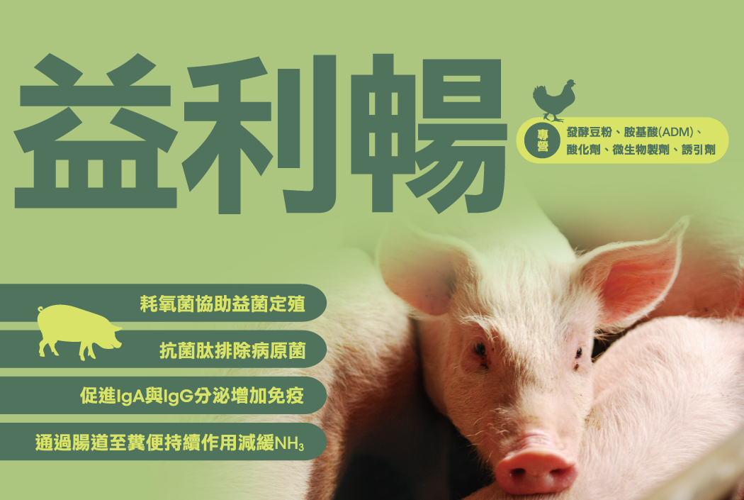 - 益利暢:禽畜益生菌,促進IgA與IgG分泌調節(jié)免疫能力、抑制多種病原菌、協(xié)助益菌定殖、降低畜舍臭味