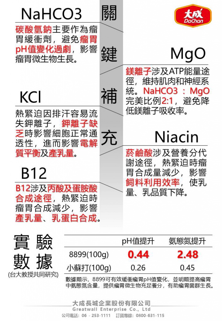 瘤胃是決定乳牛及牧場(chǎng)經(jīng)營(yíng)績(jī)效的重要關(guān)鍵,瘤胃pH值偏低時(shí)對(duì)牛隻採(cǎi)食、乳量、乳品質(zhì)及健康狀況都有著極大的影響。8899做為強(qiáng)化版的瘤胃緩衝劑,使碳酸氫鈉及鎂離子達(dá)到2:1的最佳比例,並額外添加熱緊迫時(shí)特別容易缺乏的鉀離子、菸鹼酸及維生素B12,給予最關(guān)鍵的營(yíng)養(yǎng)補(bǔ)充。